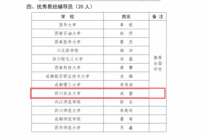 近日,四川省教育厅易班建设与发展中心公布了2025年度四川省易班共建高校优秀工作案例遴选及展示评优结果。我院辅导员成蓥老师荣获2025年度四川省“优秀易班辅导员”。