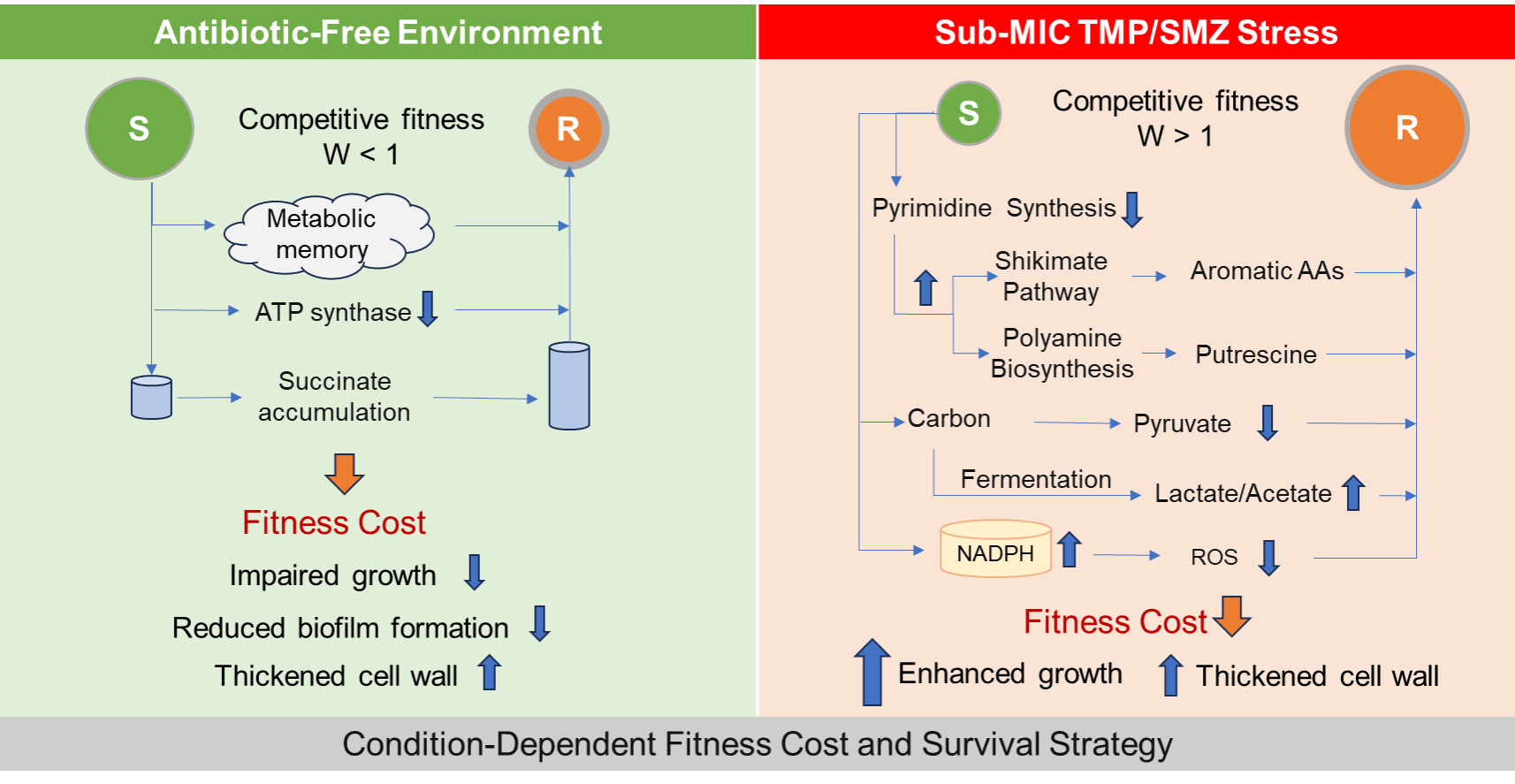 在亚抑制浓度TMP/SMZ压力下(0.125/2.375 μg/mL,模拟环境残留水平),耐药菌展现出显著生存优势:约50%的敏感菌裂解死亡,而耐药菌生长增强、竞争指数W>1。这一优势源于三大代谢重编程:(1)嘧啶合成途径受抑,资源转向莽草酸途径和多胺生物合成;(2)中心碳代谢从有氧呼吸转向发酵途径维持ATP供应;(3)谷胱甘肽代谢和NAD(P)H池激活以缓解氧化应激。