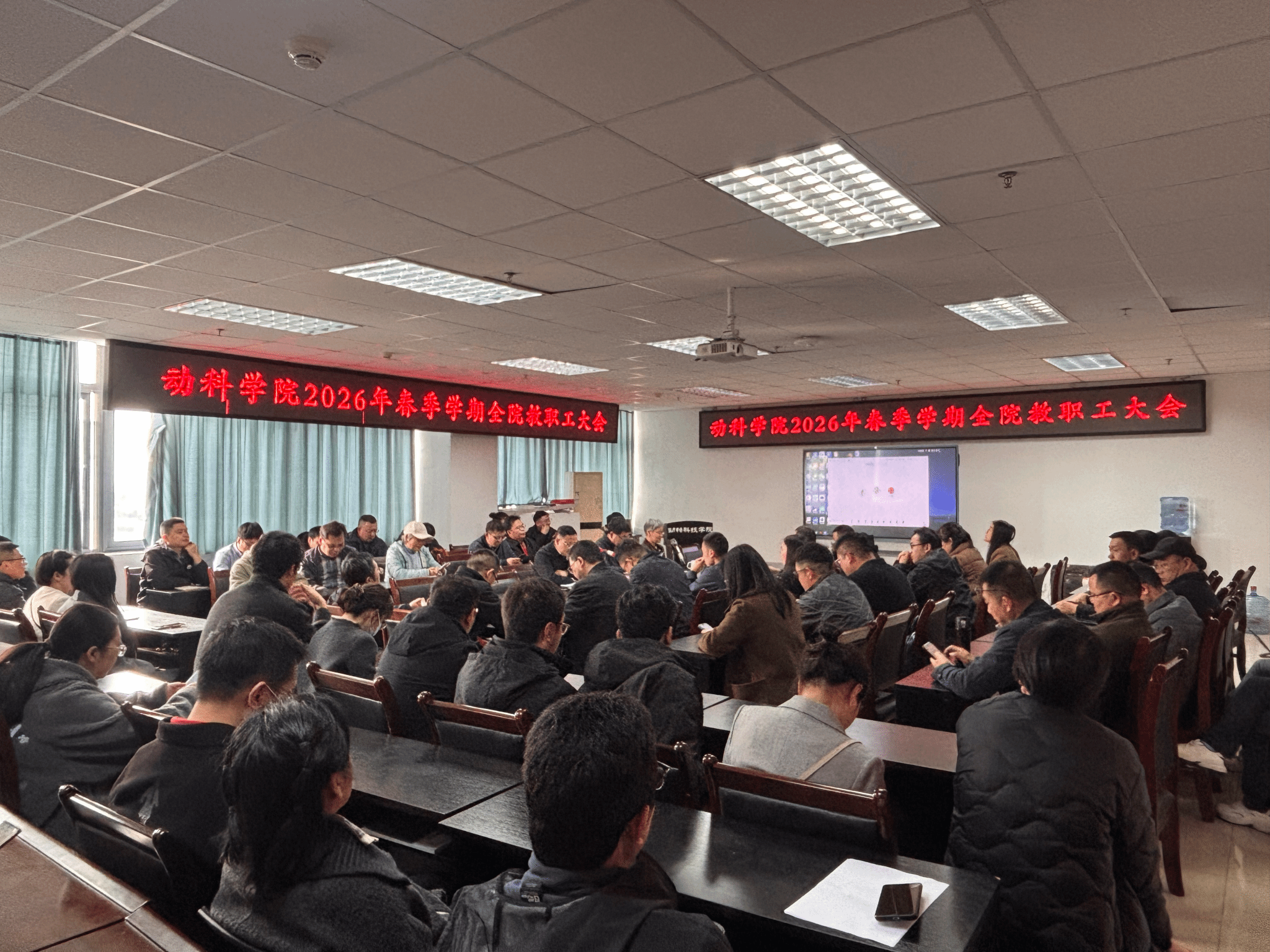 3月3日下午,学院召开2026年春季学期全体教职工大会。会议由学院党委书记何桦主持。全院80余名教职工参会。