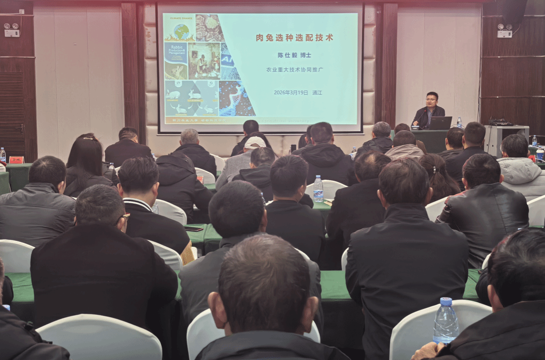 3月19日,由通江县农业农村局主办的“优质肉兔高效生产关键技术推广”培训会在通江县举行。国家兔产业技术体系岗位科学家、省兔育种新技术研发与应用岗位团队成员陈仕毅教授应邀参会,并围绕“肉兔选种选配技术”开展专题培训。来自当地行业主管部门、乡镇技术人员、养殖企业代表及规模养殖户等90余人参加培训。