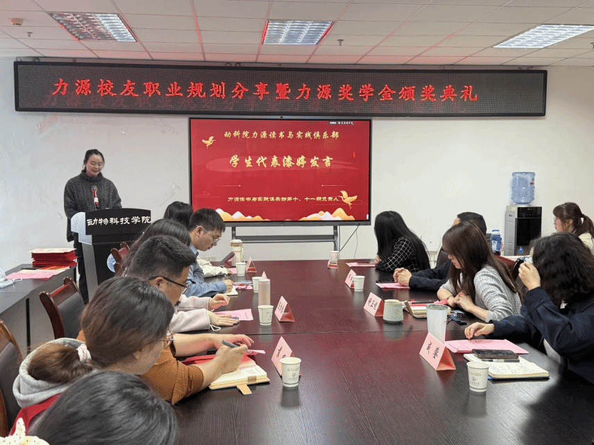 本校校友、力源集团饲料研发中心区域负责人胡安海,力源集团招聘经理陈怡怡、力源鸡事业部招聘经理胡烨、力源猪事业部区域人力负责人袁田受邀参与本次大会,学院党委书记何桦、党委办公室副主任舒正悦、党委办公室老师张营营、成蓥及我院80余名学生参会。