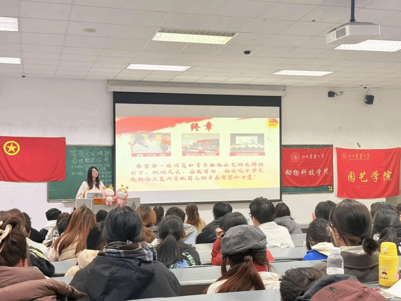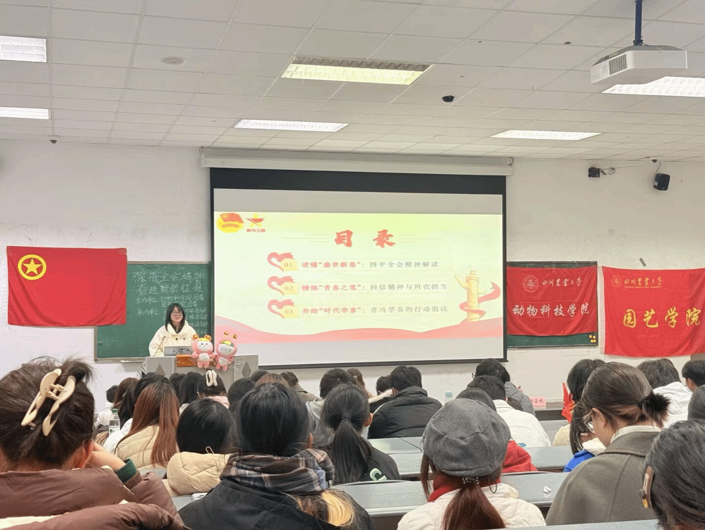为深入学习贯彻习近平总书记在党的二十届四中全会上的重要讲话精神,引导广大团员青年深刻领悟全会提出的重大战略部署,进一步坚定理想信念、厚植家国情怀、勇担历史使命,奋力书写为中国式现代化挺膺担当的青春篇章。动物科技学院团委直属部门流动团支部、园艺学院团委直属部门流动团支部、动科202501班团支部、动科202505班团支部、园艺202505班团支部、园艺202506班团支部于4-A105联合开展“深悟全会精神,奋进崭新征程”的主题班团活动。本次示范性班团活动分为五个篇章展开,吸引了180名团员青年积极参与。