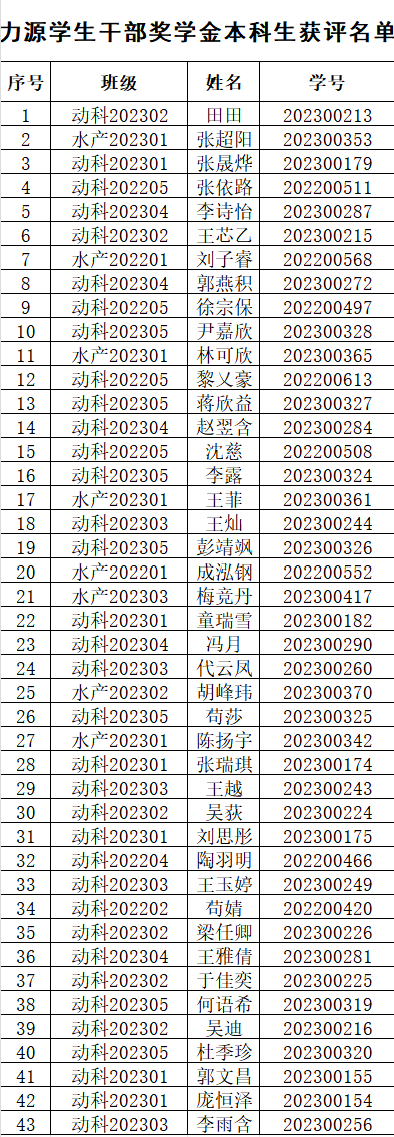 经学生本人申请、学院资格审查及评审工作小组评审,现将动物科技学院2025年力源学生干部奖学金拟评名单予以公示。