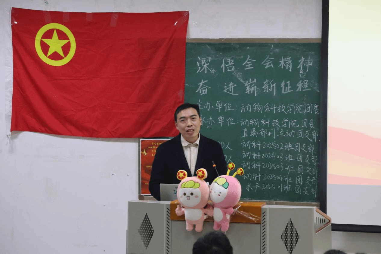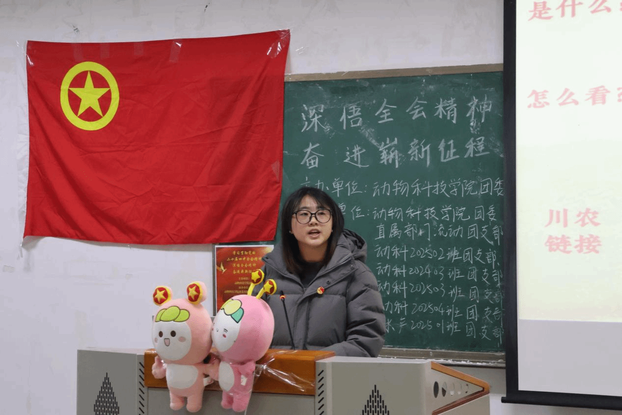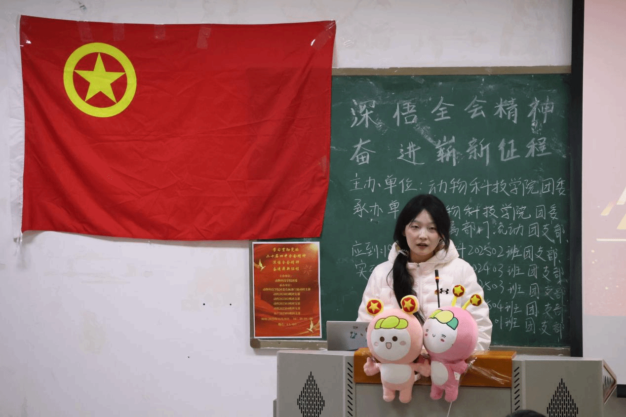 为深入学习领会党的二十届四中全会精神,引导广大青年学子坚定理想信念、锤炼过硬本领、厚植专业报国情怀,学院团委直属部门流动支部、动科202403班团支部、动科202502班团支部、动科202503班团支部、动科202504班团支部、水产202501班团支部于4A-105联合开展“深悟全会精神,奋进崭新征程”的主题班团活动。本次示范性班团活动设置了五大篇章,层层递进传递全会精神,激发青年担当,吸引了180余名同学踊跃参与。