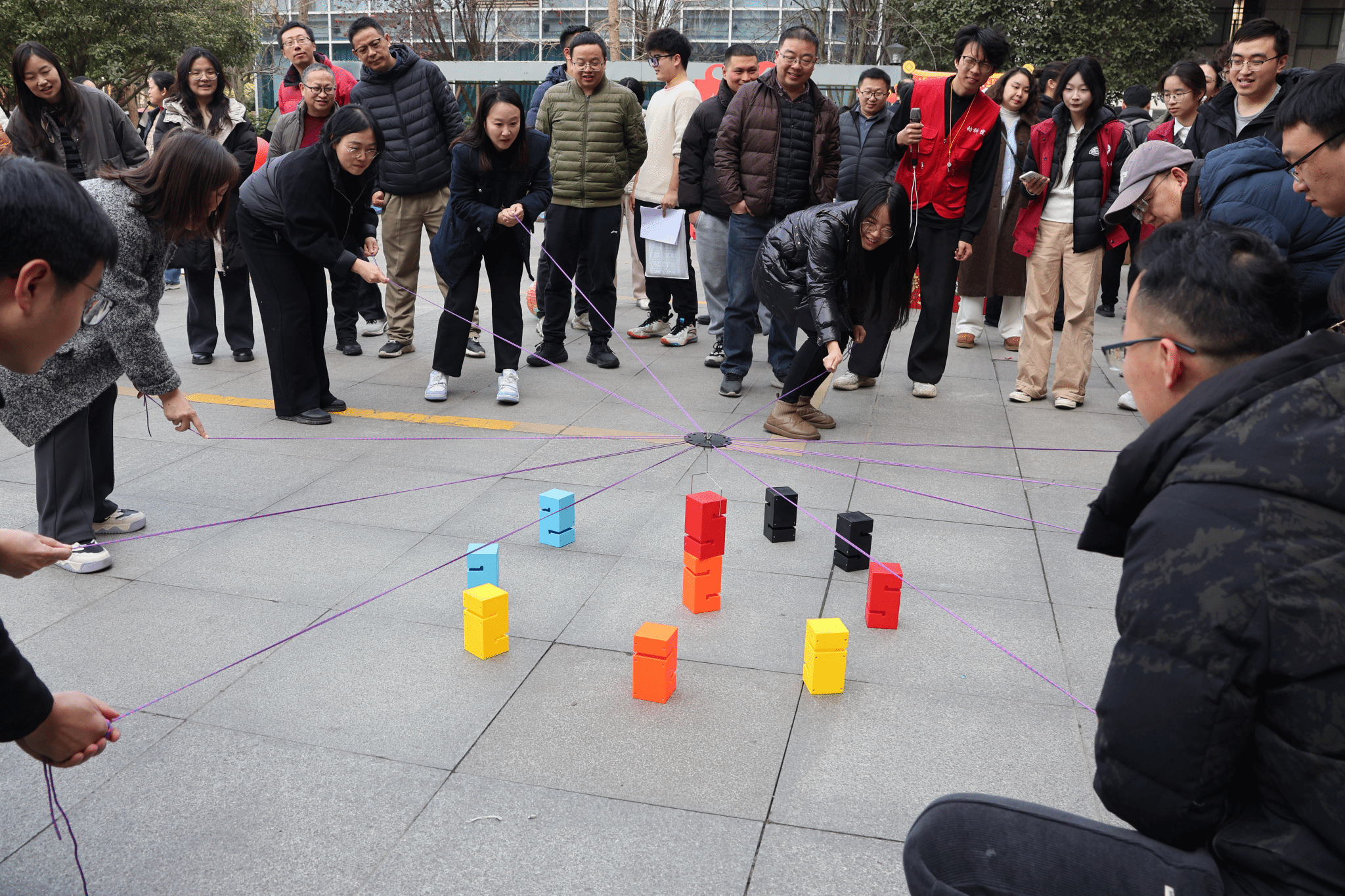 本次游园活动设置了拔河、合力建塔、趣味套大鹅、趣味保龄球、趣味三子棋、飞镖投掷、投掷套圈共七项集体竞赛,各系室、中心师生混合组队,展开了激烈而有趣的角逐。